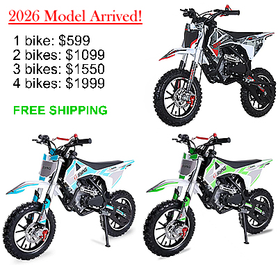 SYX MOTO 60cc 4-Stroke Air Cooled Pit Bike PAD60-1 (Tearoff) comes with an electric start, just push a button to get this "Tearoff" started! Tubeless and knobby tires, aluminum rims, inverted forks, dual disc brakes... This is a great advantage for young riders just starting out. A list of excellent features make this a popular gift for the kids all year round! $599 for the 2nd bike, price will adjust during checkout.